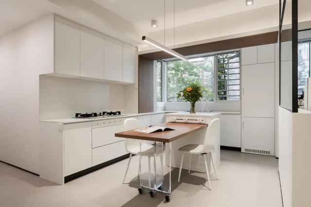 比如把客厅与厨房打通,做成开放式厨房+岛台,岛台既能备餐又能当餐桌;等于是节省了一个餐厅的面积,还让小客厅面积变得更宽敞。