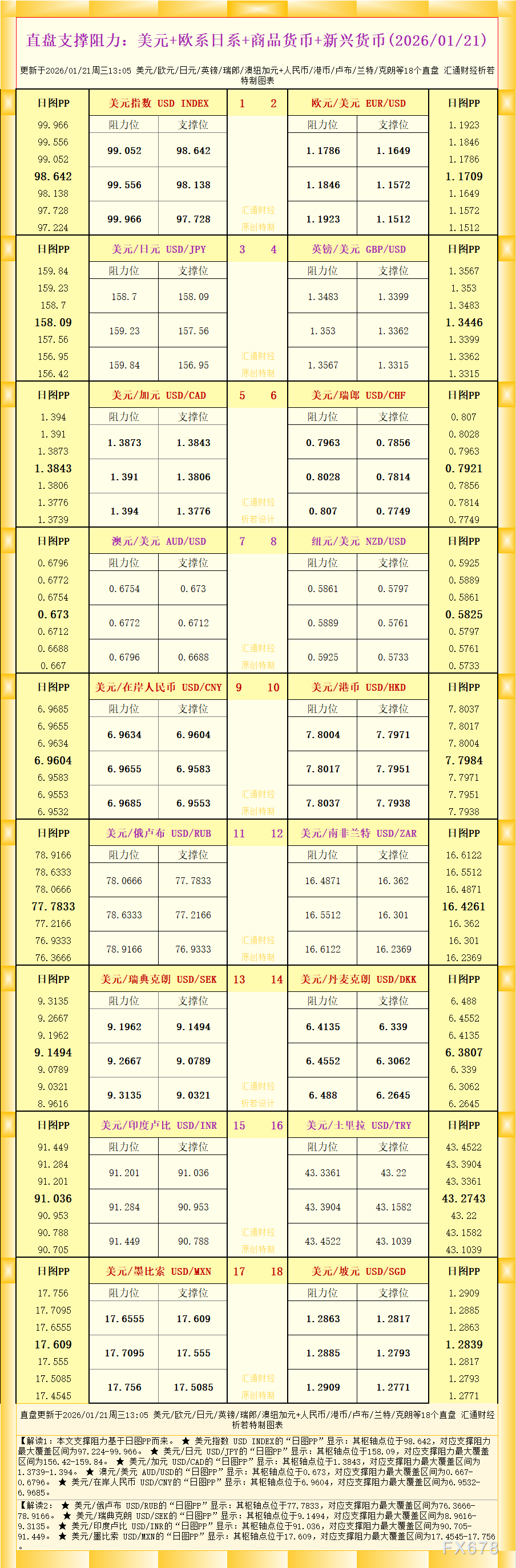 汇通财经APP讯——一张图看直盘支撑阻力:美元+欧系日系+商品货币+新兴货币,更新于2026年1月21日周三13:05,具体美元/欧元/日元/英镑/瑞郎/澳纽加元+人民币/港币/卢布/兰特/克朗等18个直盘,更多详见汇通财经析若特制图表中的内容。